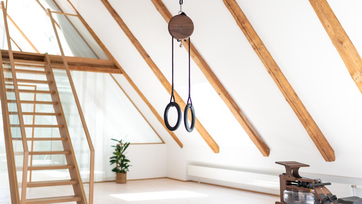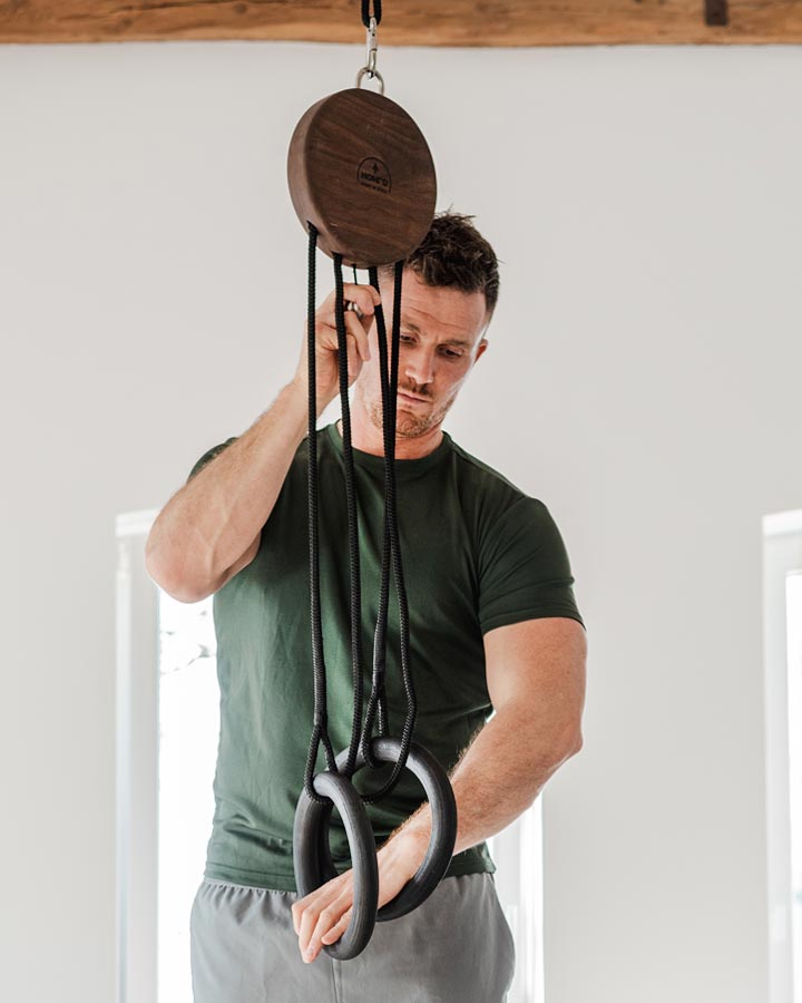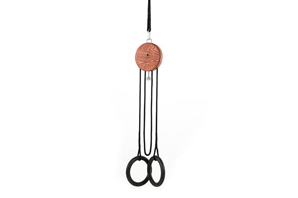 Pevné pouzdro z masivního dřeva v kombinaci s černě mořenými kruhy o průměru 24 cm dodává trenažéru NOHRD Sling přirozený vzhled. Závěsný systém lze snadno připevnit pomocí karabiny ke stropu nebo větvi.